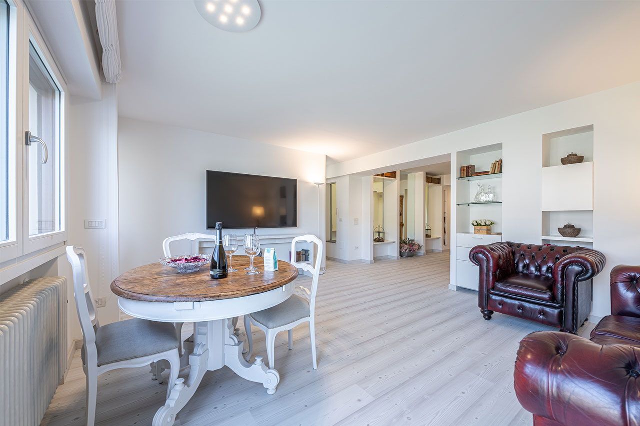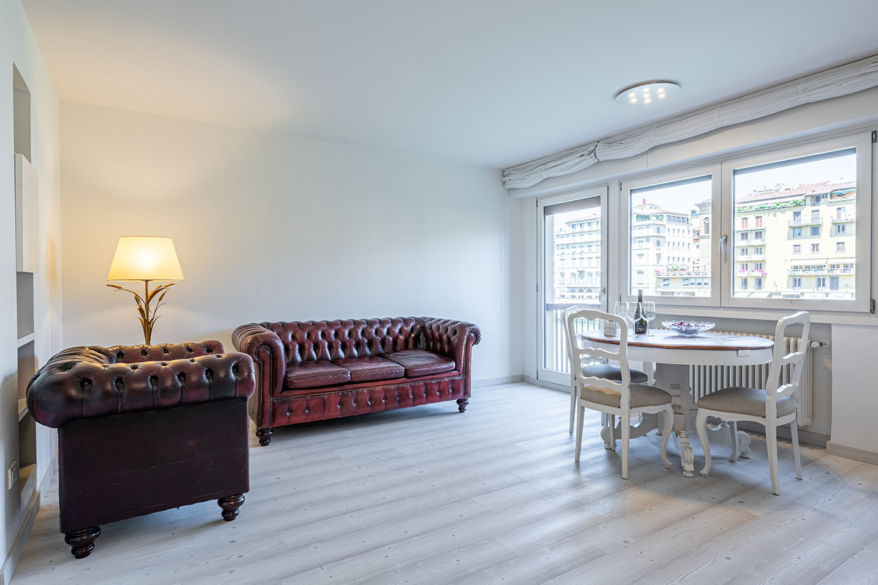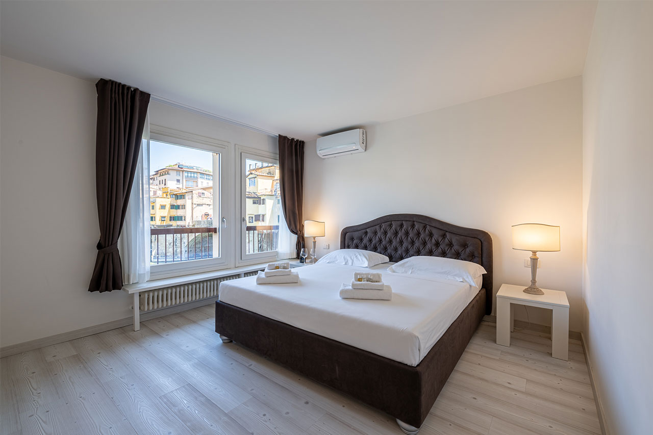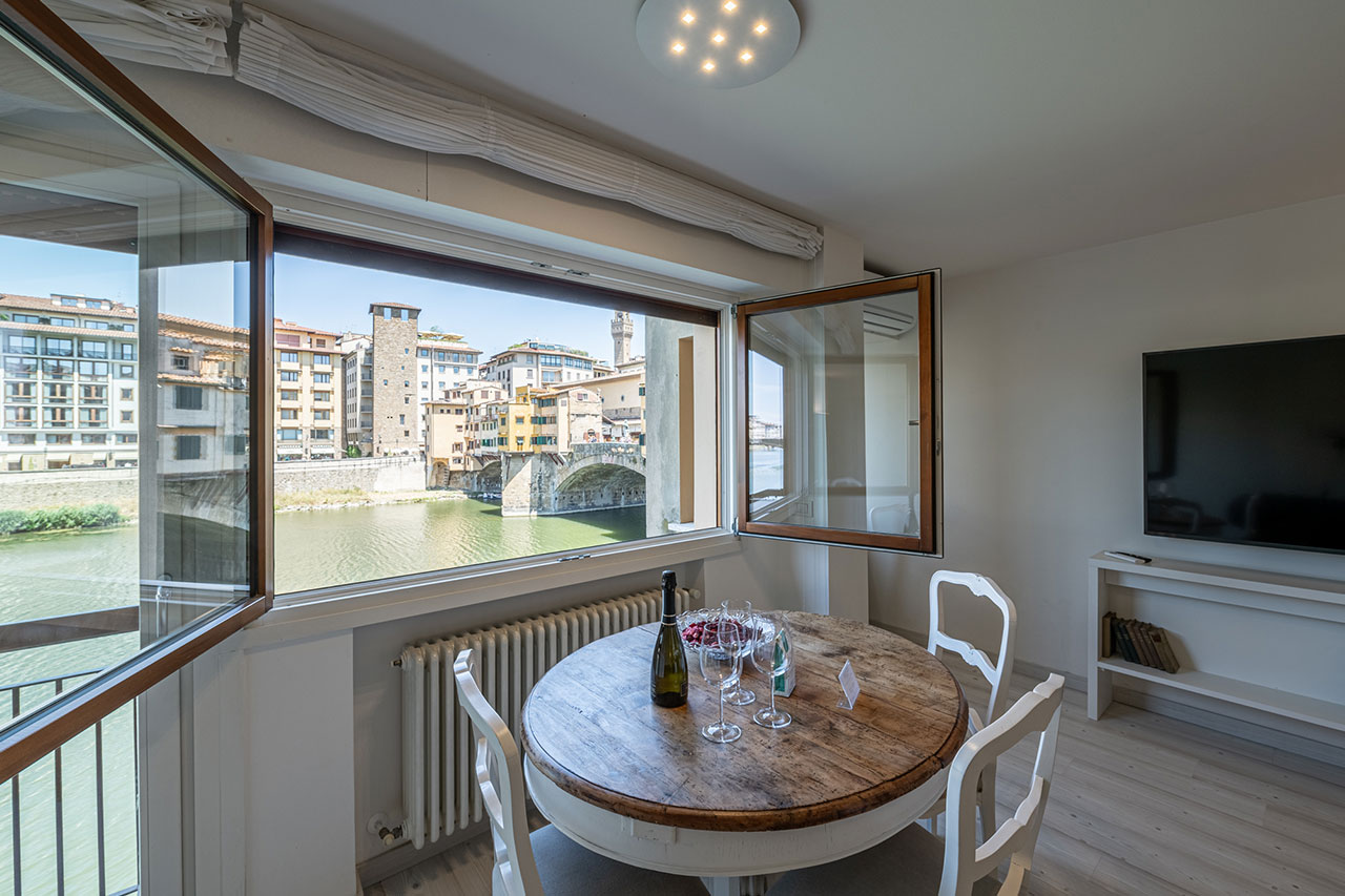 La zona living è arredata con pezzi di design che donano all’ambiente carattere ed eleganza, quali un comodo divano in pelle, una poltrona in stile Chesterfield, un ampio e suggestivo tavolo in legno ed una Smart TV LG 4K Ultra HD da 70″. Da questa stanza si accede ad un piccolo e caratteristico balconcino dal quale ti sembrerà di essere sospeso sull’Arno.